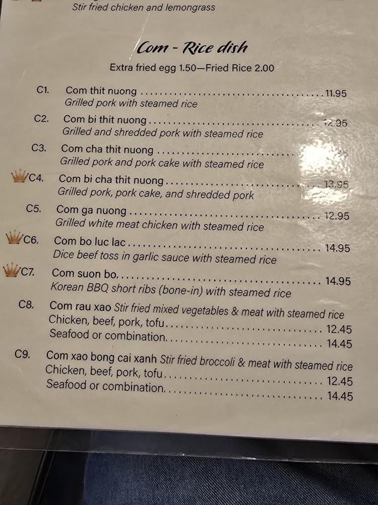 Vegetarian dishes highlight innovative ingredients, ensuring there's something for everyone. Diners can also find Banh Mi sandwiches which burst with fresh ingredients, marrying traditional flavors with accessibility. Don’t overlook appetizers like the Goi Cuon, bringing a fresh, vibrant touch to your meal. The comprehensive beverage menu includes refreshing bubble tea, a fun addition to any dining experience. In short, the menu balances tradition and innovation, satisfying a wide range of tastes.